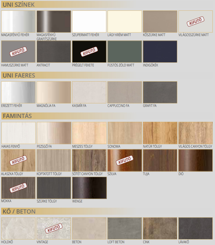 Színválaszték: magasfényű fehér, szupermatt fehér, lágy krém matt, matt kasmír, kőszürke matt, antracit, matt fekete, matt nádzöld, füstös zöld matt, matt indigókék, sonoma, natúr tölgy, dohány tölgy, tuja, loft beton, grafit fa, szilva, mokka