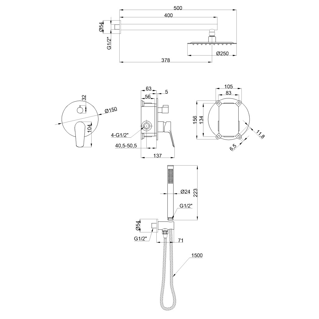 A készlet tartalmaz egy 2 funkciós beépített zuhany csaptelepet és egy 2,5 cm átmérőjű egyfunkciós zuhanyfejet, amely szintén rendelkezik anti-calc rendszerrel.