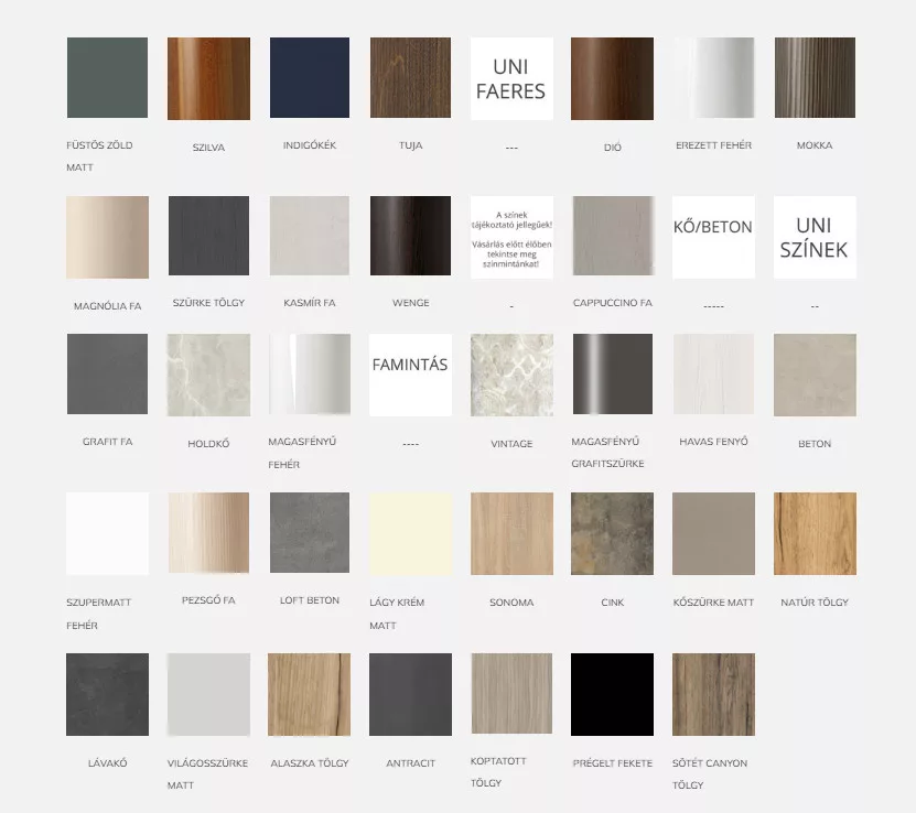 Színválaszték: magasfényű fehér, szupermatt fehér, lágy krém matt, matt kasmír, kőszürke matt, antracit, matt fekete, matt nádzöld, füstös zöld matt, matt indigókék, sonoma, natúr tölgy, dohány tölgy, tuja, loft beton, grafit fa, szilva, mokka