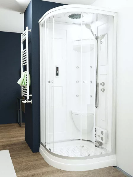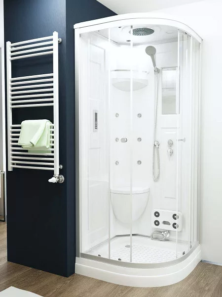 Üvegszál erősítéses, acél merevítésű, fehér színű, akril zuhanytálca, állítható fém lábakkal