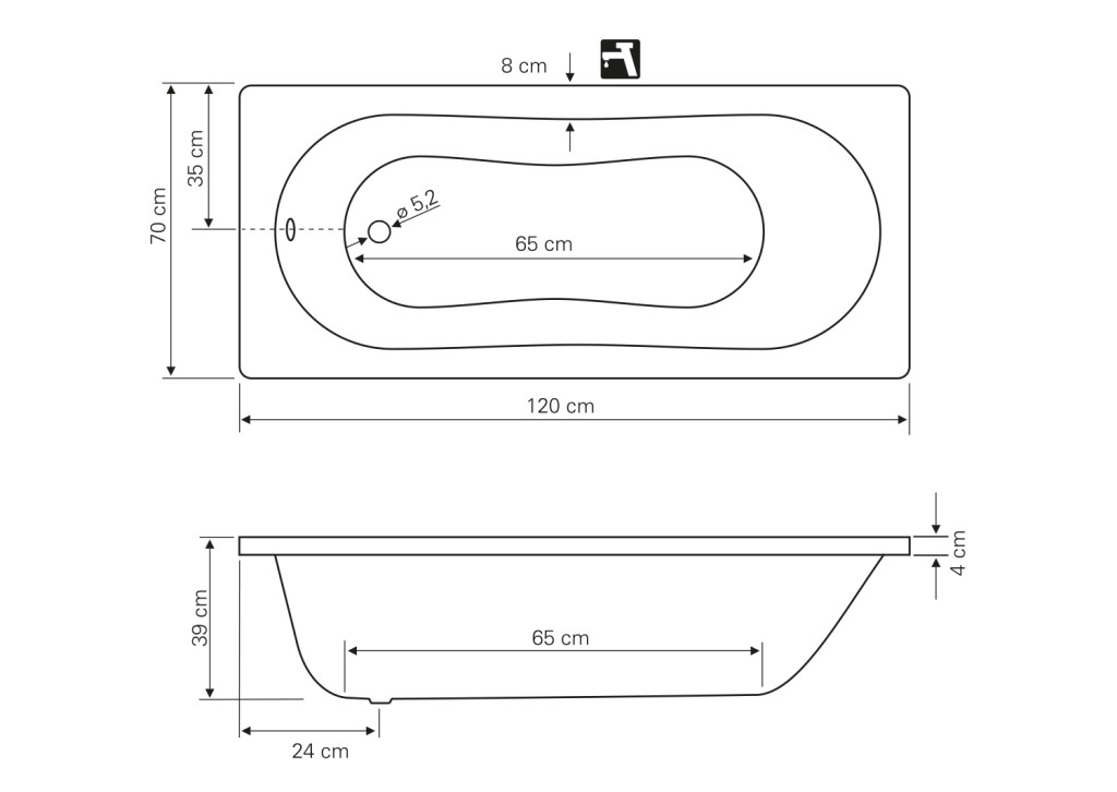 A le- és túlfolyó a kád közepén helyezkedik el