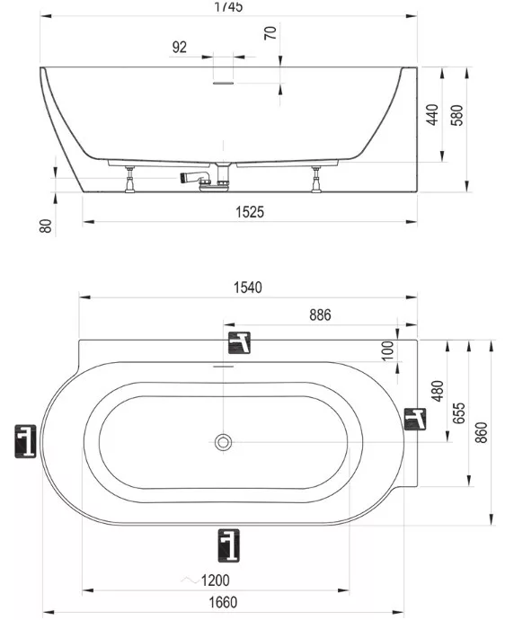 A tartóláb és az integrált le- és lefolyó a termék tartozéka.