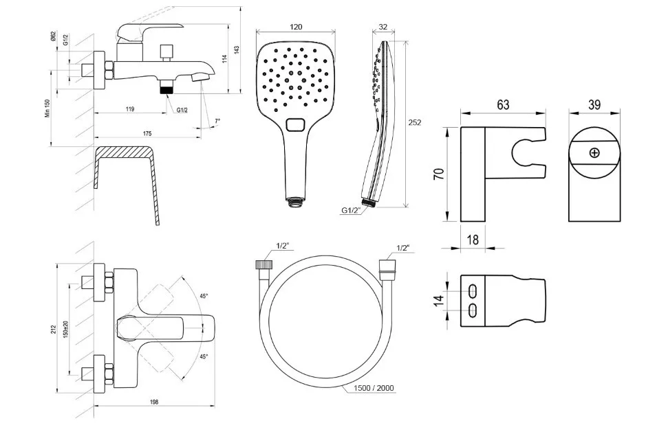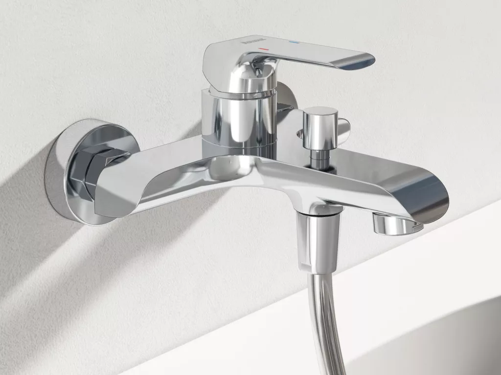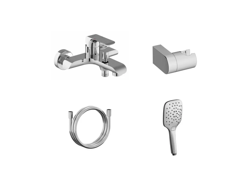 A kádcsaptelep szett tartalma: FL 022.00CR Flat fali kádtöltő csaptelep, króm, 958.00CR Kézi zuhany 3 funkcióval, króm, 611.00CR Állítható zuhanytartó, króm, 913.00CR Zuhanytömlő, króm