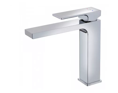 Króm színű mosdó csaptelep, amely a modern formákat tükrözi.