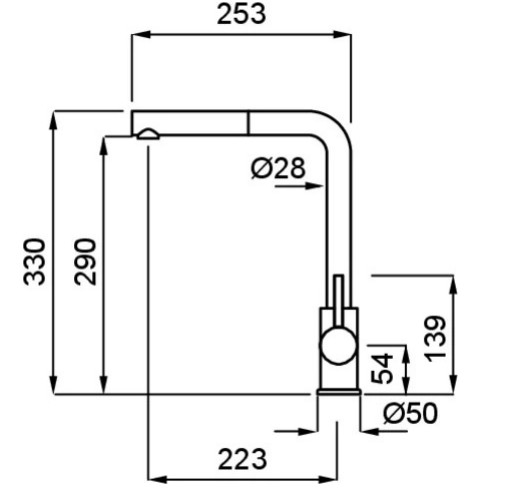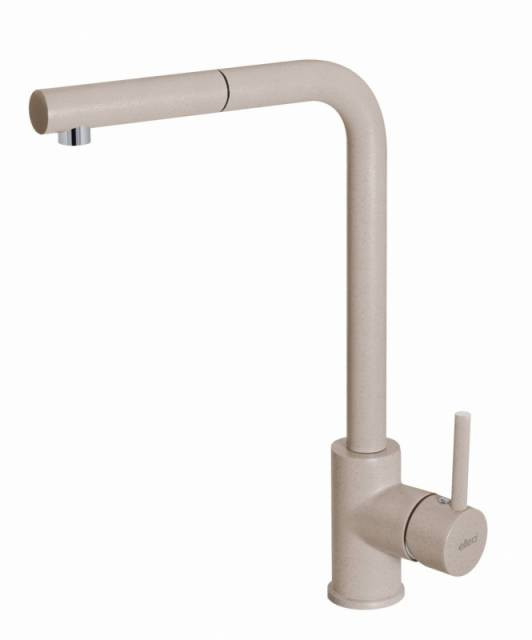 Egykaros modern "L" alakú, kerámiabetétes csaptelep, oldalsó szabályzóval, forgatható kifolyócsővel, kihúzható fejjel, normál beépítéssel, O35 mm-es furattal.