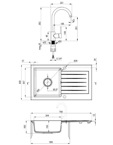 1 medencés, gránit mosogató csepegtetővel, csapteleppel