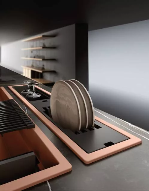 A különleges kifolyásgátló szél lehetővé teszi a kiegészítők mosogatótálca mentén történő csúsztatását, és korlátozza a víz kifolyását.