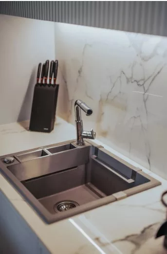 Mosogatógép-csatlakozással ellátott szerelvényekkel felszerelt mosogató