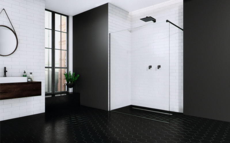 Fali profillal a falra szerelhető fekete pengefal 8 mm-es Easy Clean edzett üvegből.