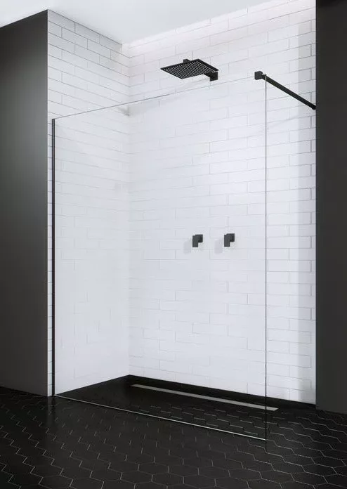 Fali profillal a falra szerelhető fekete pengefal törölközőtartóval 8 mm-es Easy Clean edzett üvegből.