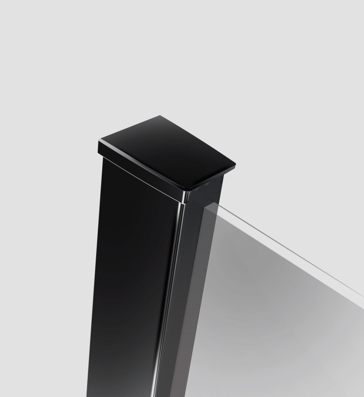 Fali profillal a falra szerelhető fekete pengefal 8 mm-es Easy Clean edzett üvegből.