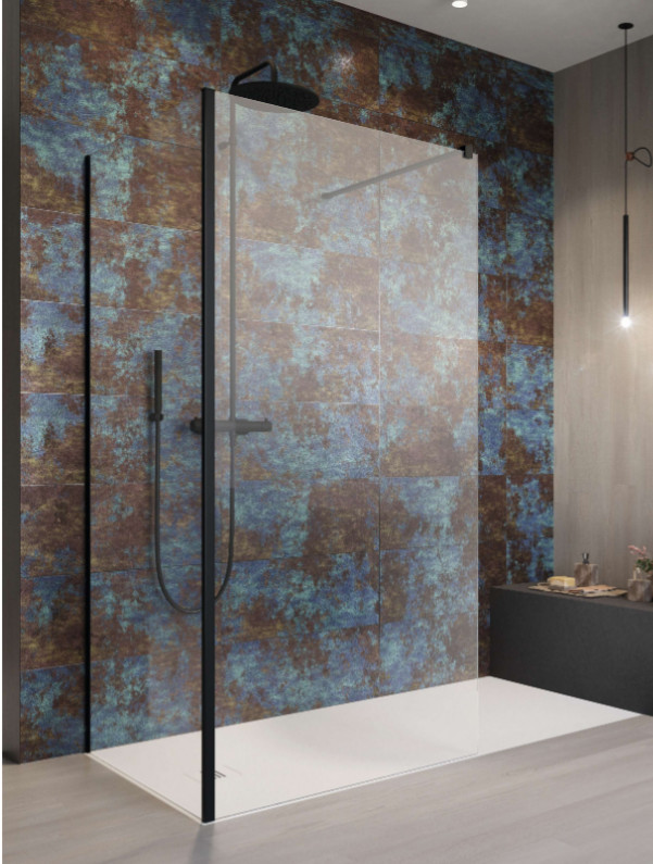 Fali profillal a falra szerelhető fekete pengefal 8 mm-es Easy Clean edzett üvegből.