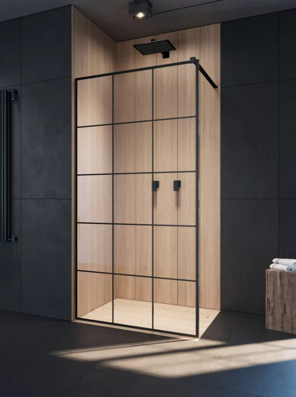 Fali profillal a falra szerelhető fekete pengefal 10 mm-es Easy Clean edzett üvegből, Factory mintával.