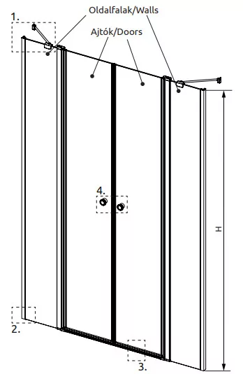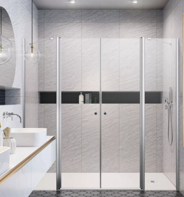 Dupla lengőajtós zuhanyajtó két oldalt fix résszel.