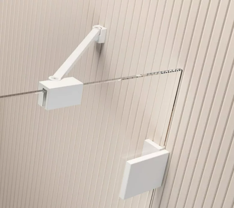 Kifelé nyíló fehér zuhanyajtó fix résszel.