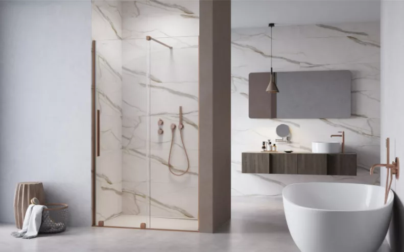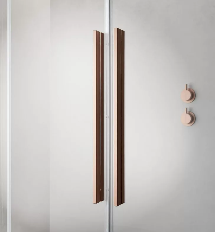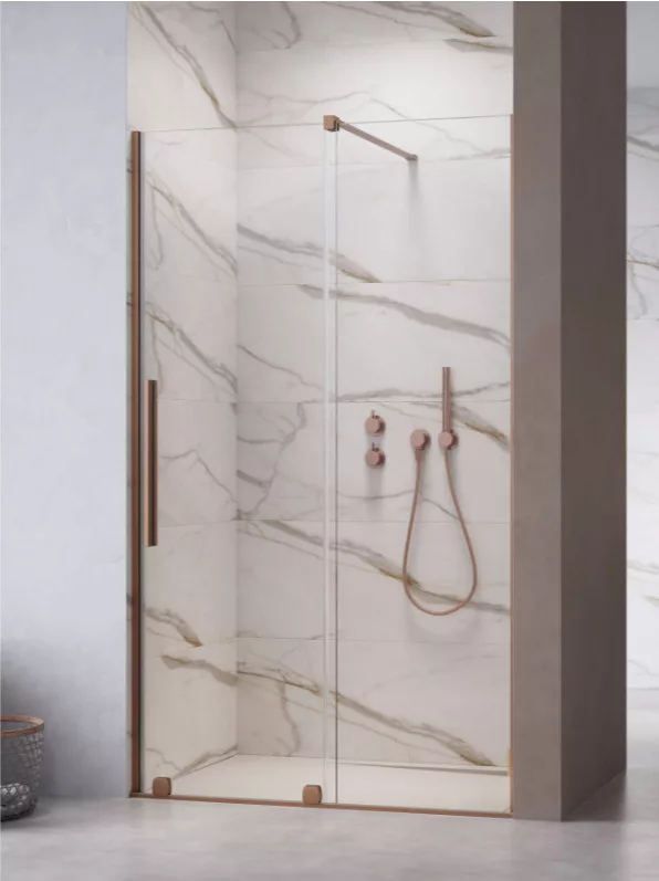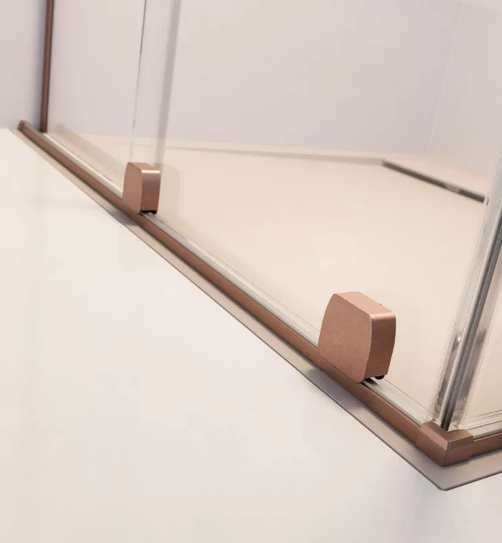 Alsógörgős zuhanyajtó egy fix résszel, szálcsiszolt réz kivitel.