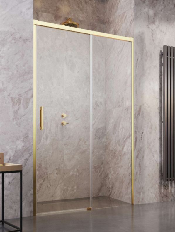 Görgős arany zuhanyajtó egy fix résszel.