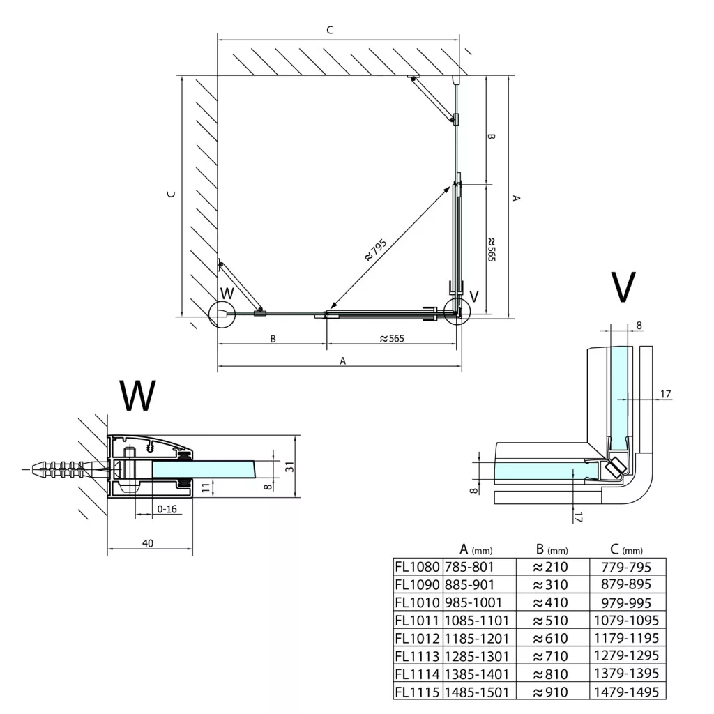 Bejárati szélesség - sarok (két ajtó csatlakozása): 795 mm