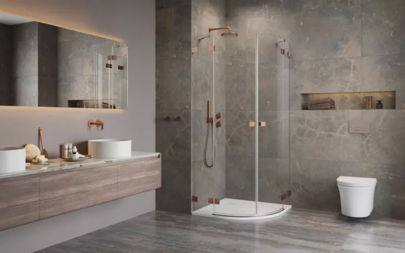 Íves zuhanykabin kifelé nyíló ajtókkal, oldalanként fix résszel, szálcsiszolt réz kivitel.