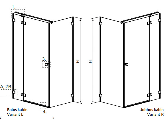 Szögletes zuhanykabin kifelé nyíló ajtóval és egy fix oldalfallal, szálcsiszolt fegyvermetál kivitel.