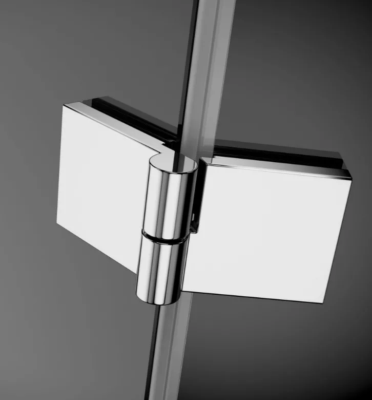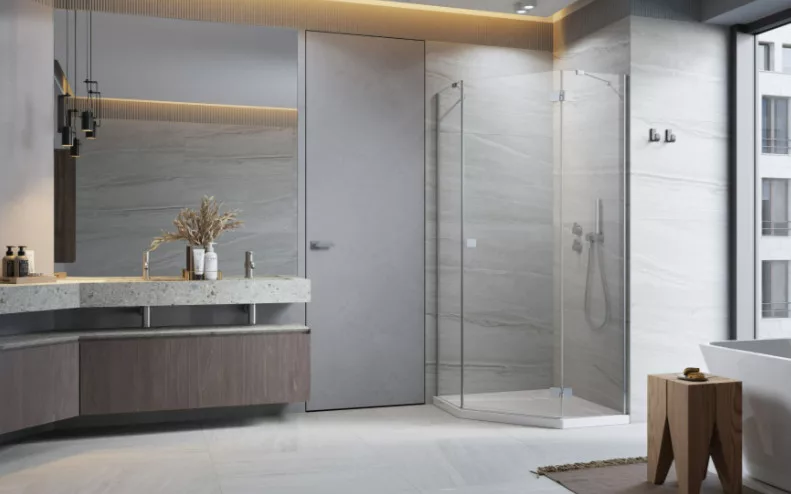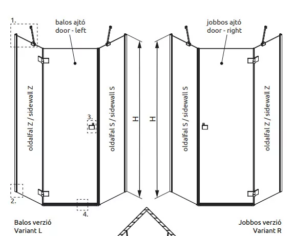 Ötszögletű zuhanykabin két fix résszel, kifelé nyíló ajtóval.