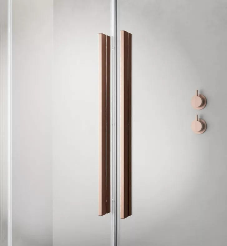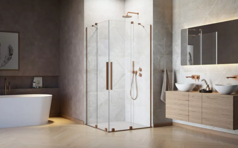 Szögletes zuhanykabin dupla, alsógörgős ajtókkal, szálcsiszolt réz változat.Méret: 90x80 cm