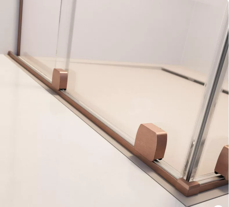 Szögletes zuhanykabin egy fix és egy alsógörgős ajtóval, szálcsiszolt réz változat.