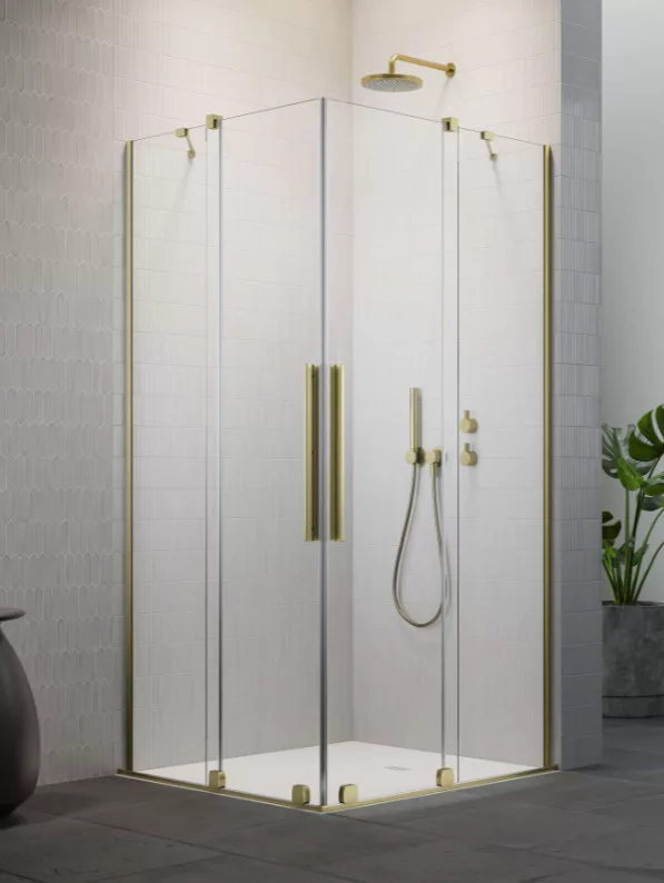 Szögletes zuhanykabin dupla, alsógörgős ajtókkal, szálcsiszolt arany változat.