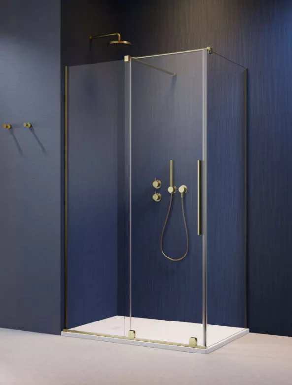Szögletes zuhanykabin egy fix és egy alsógörgős ajtóval, szálcsiszolt arany változat.