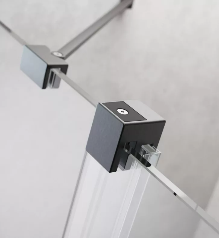 Szögletes zuhanykabin egy fix és egy alsógörgős ajtóval, szálcsiszolt fegyvermetál változat.