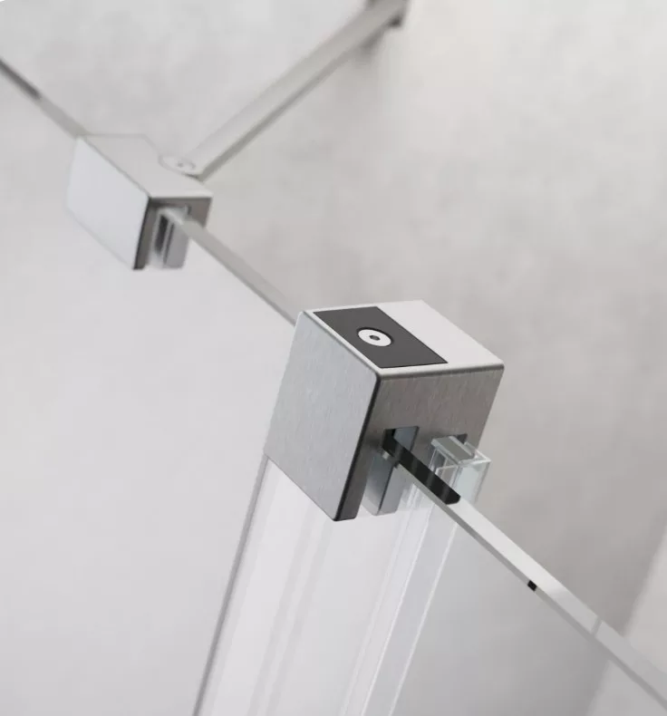 Szögletes zuhanykabin egy fix és egy alsógörgős ajtóval, szálcsiszolt króm változat.