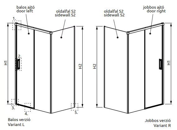 Szögletes fekete zuhanykabin egy görgős ajtóval és egy fix oldalfallal.
