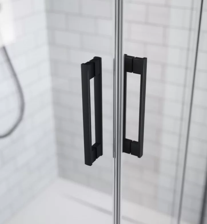 Szögletes fekete zuhanykabin egy görgős ajtóval és egy fix oldalfallal.