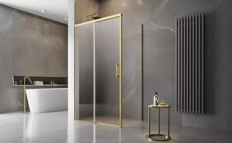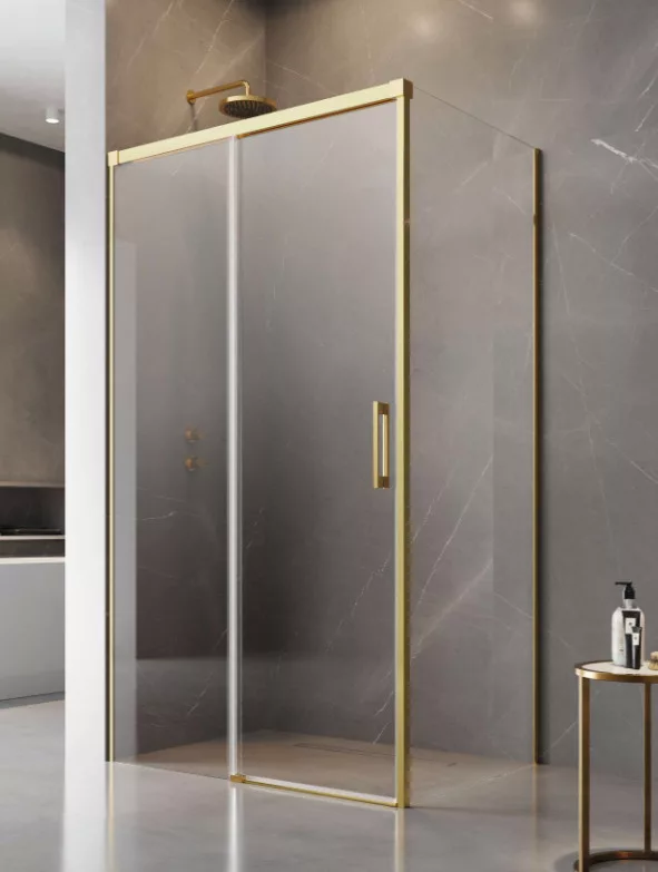 Szögletes arany zuhanykabin egy görgős ajtóval és egy fix oldalfallal.