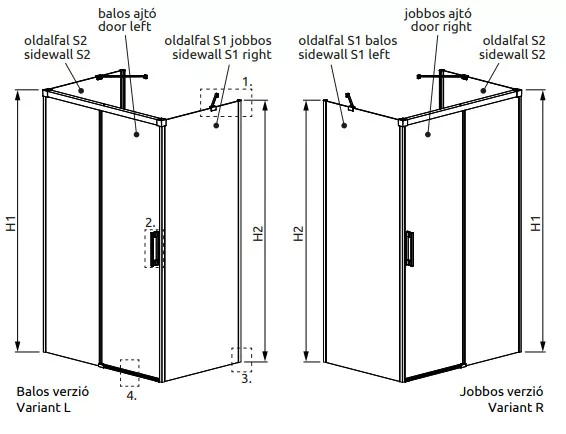 Egyenes falra építhető, háromoldalú szögletes zuhanykabin két fixfallal és egy görgős ajtóval.