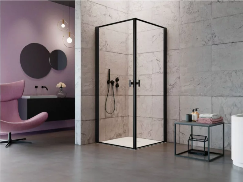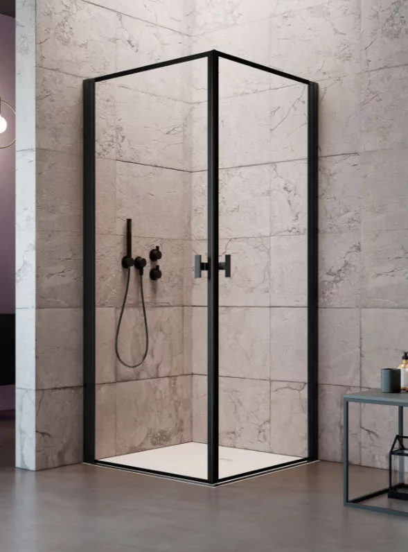 Szögletes fekete zuhanykabin teljesen a falra hajtható dupla nyílóajtóval, Frame mintával.