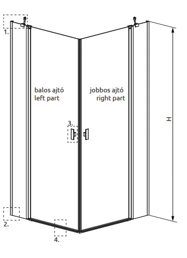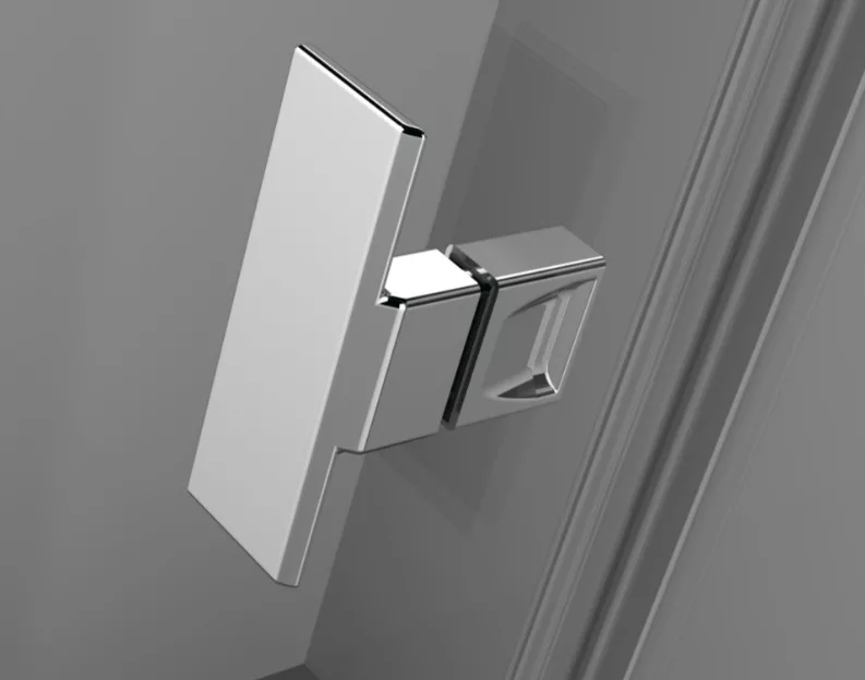Szögletes zuhanykabin teljesen a falra hajtható dupla nyílóajtóval.