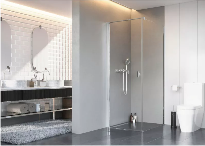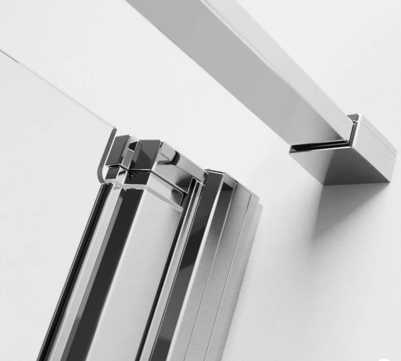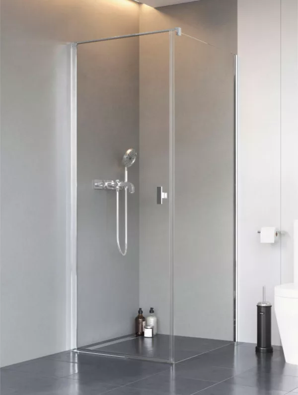 Kifelé-befelé nyíló szögletes zuhanykabin egy fix és egy nyíló oldallal.