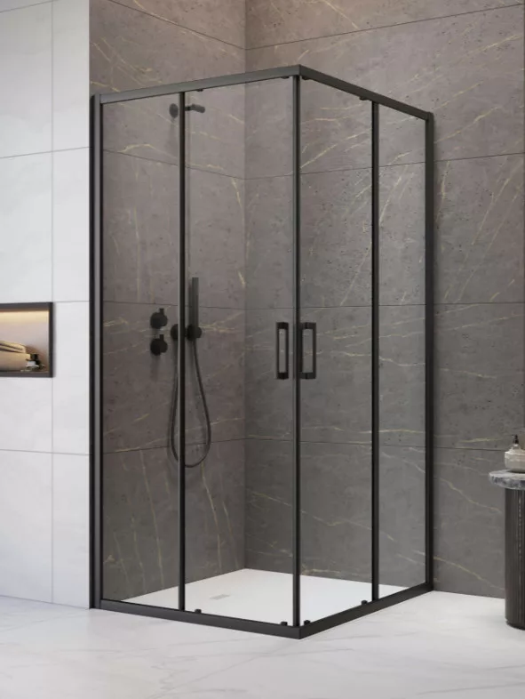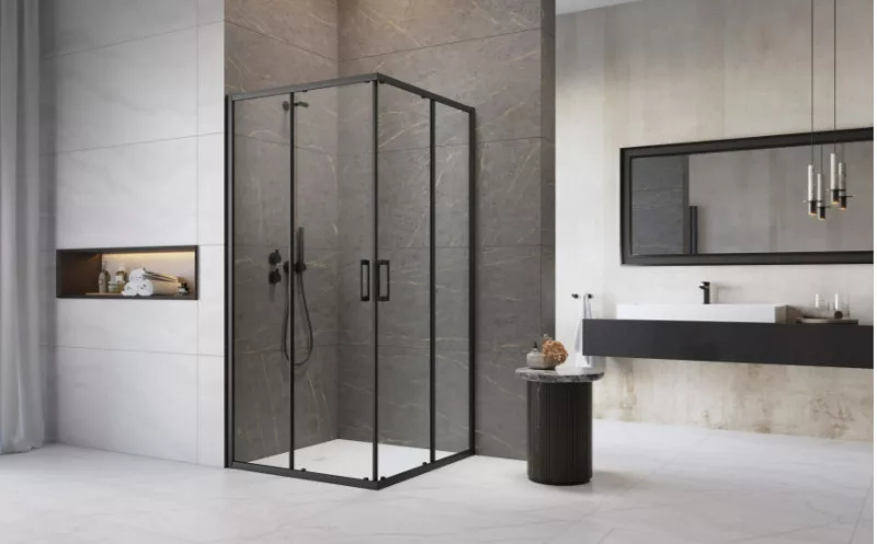 Szögletes fekete zuhanykabin görgős dupla ajtóval, két fix résszel.