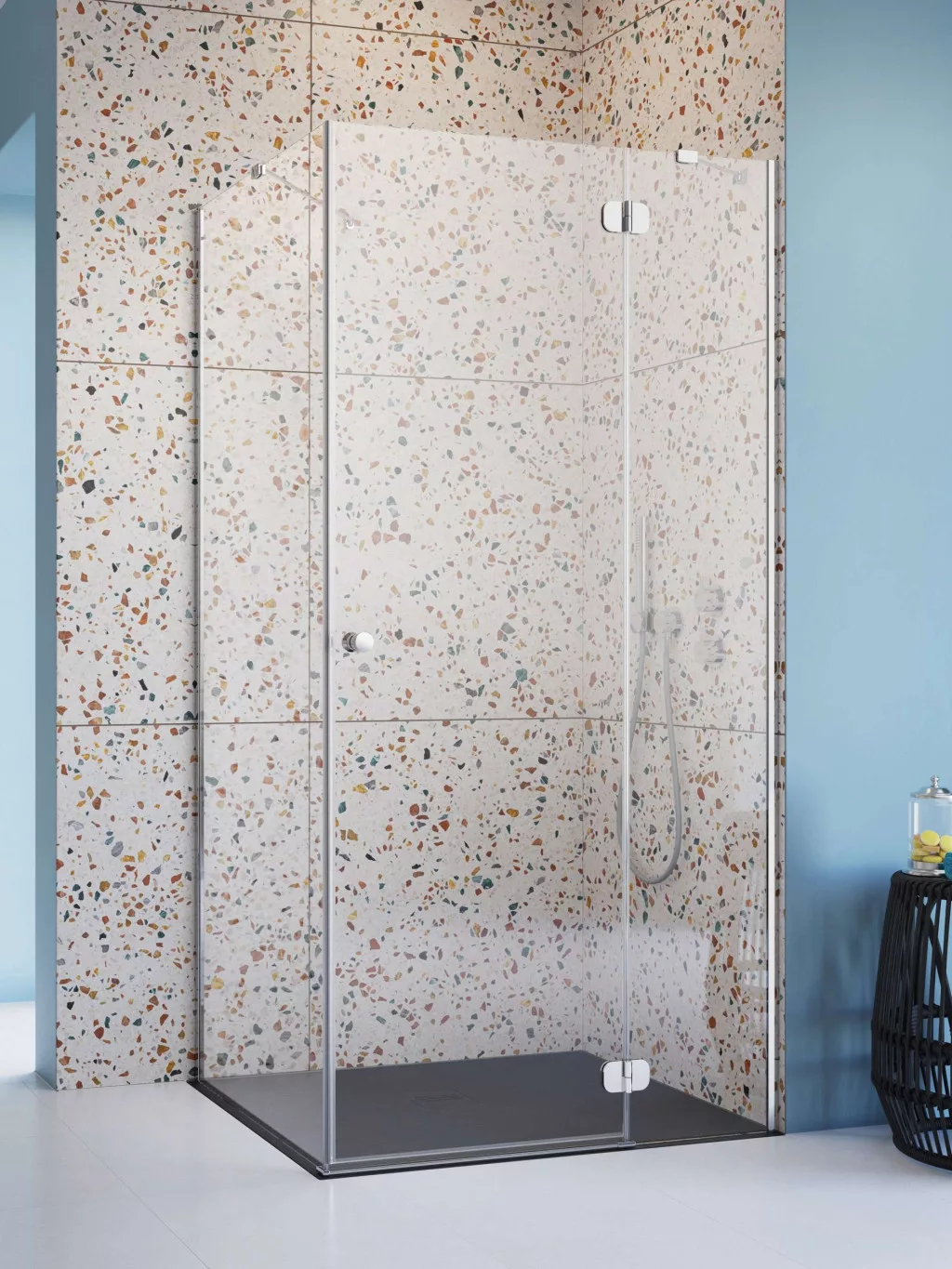 Kifelé nyíló szögletes zuhanykabin egy ajtóval és egy fix oldalfallal