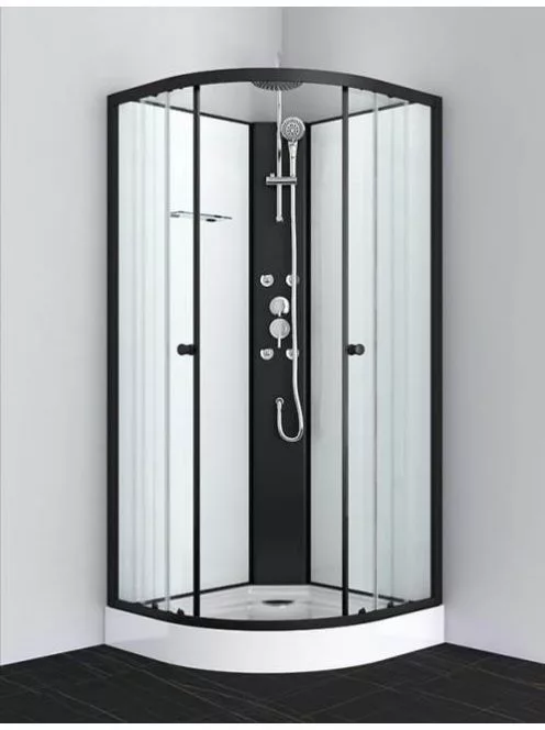 RELOAD hidromasszázs zuhanykabin, feketefrontüvegek: 4 mm-es biztonsági üveghátfalak: 4 mm-es fehér biztonsági üveghátmasszírozó panel, fekete4 hátmasszírozó fúvókafekete alumínium keretkeverő csaptelep és funkcióváltóesőztető fejzuhany, krómtöbbfunkciós kézi zuhany, krómüvegpolczuhanytálca (magassága: 16 cm)Az összeszereléshez a megadott méreteken felül minden irányban kb. 10-20 cm szükséges!